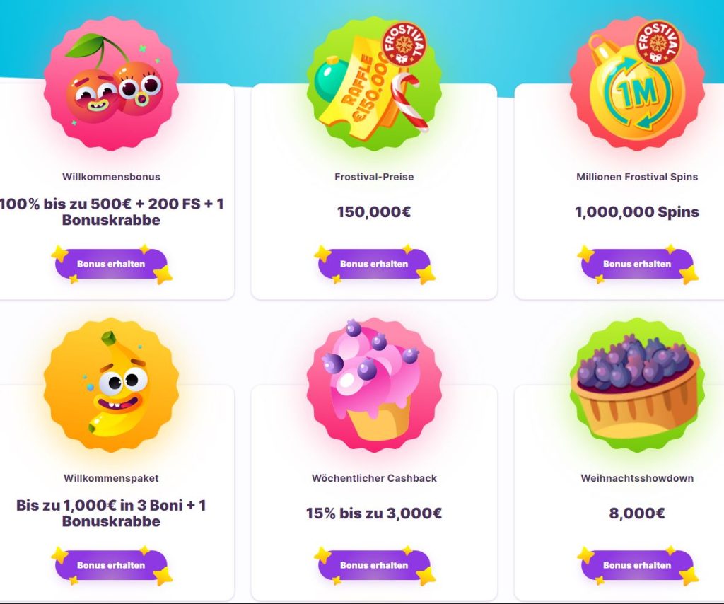 - Kirschbonus: Erhalten Sie einen 100%-Bonus bis zu 500 €, zusammen mit 200 Freispielen und 1 Bonuskrabbe.